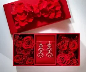 Confezioni speciali valorizzano la preziosità dei gioielli, tra scatole in velluto, rose stabilizzate e fiorellini rossi