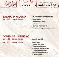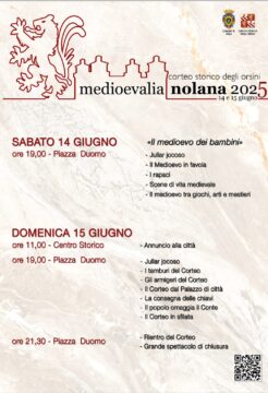 Organizzato dall’Associazione “FAG per Nola – Corteo Storico degli Orsini” e con il patrocinio del Comune di Nola, Medioevalia rappresenta un viaggio nel tempo tra costumi d’epoca, musica antica, sbandieratori, armigeri, duelli, danze medievali e spettacoli itineranti.
